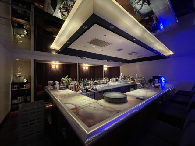 エントランスを抜けて最初に目に飛び込んでくるのが、重厚感あふれる長いバーカウンターです。