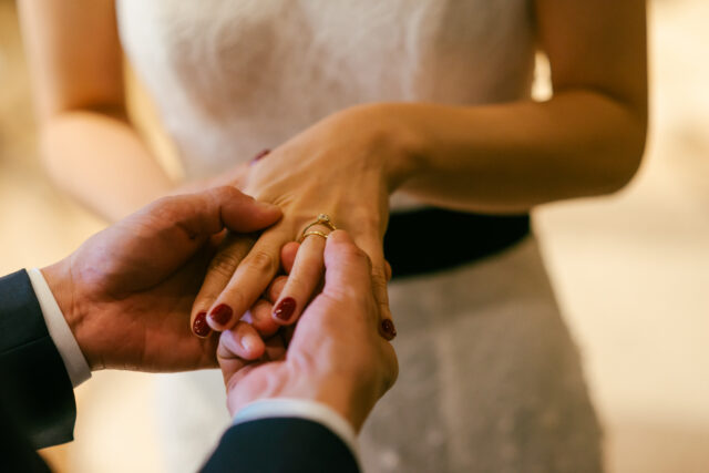 お二人の手元にカラフルなリボンが幾重にも巻かれていく様子は、視覚的にとても華やかです。指輪の交換よりも動きが大きいため、後ろの席のゲストからも何をしているか分かりやすく、写真や動画にも美しく残ります。